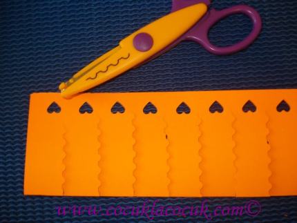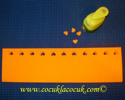 Kağıdımızı dikdörtgen şeklinde kesip uzun kenarından ikiye katladık. Uçlarını kalp şekilli delgeçle süsledik.