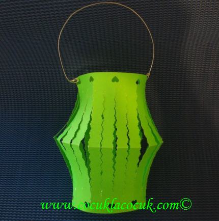 Katladığımız yerden açıp iki kısa kenarını yapıştırarak birleştirdik. Bu yeşil fenerimizin üst tarafından ince bir tel geçirdik. Böylece istediğimiz yere asabildik.