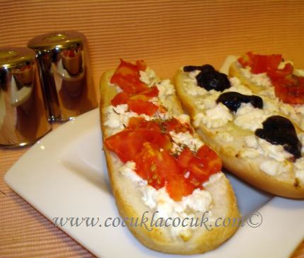 Önce sandwich ekmeklerini ortadan ikiye böldüm. Üstlerine tereyağ sürdükten sonra beyaz peynir koydum. Yarısını domates ve kekikle yarısını da çekirdeğini çıkarıp kestiğim zeytinlerle süsledim. Fırında tereyağ ve peynirler eriyinceye dek pişirdim.